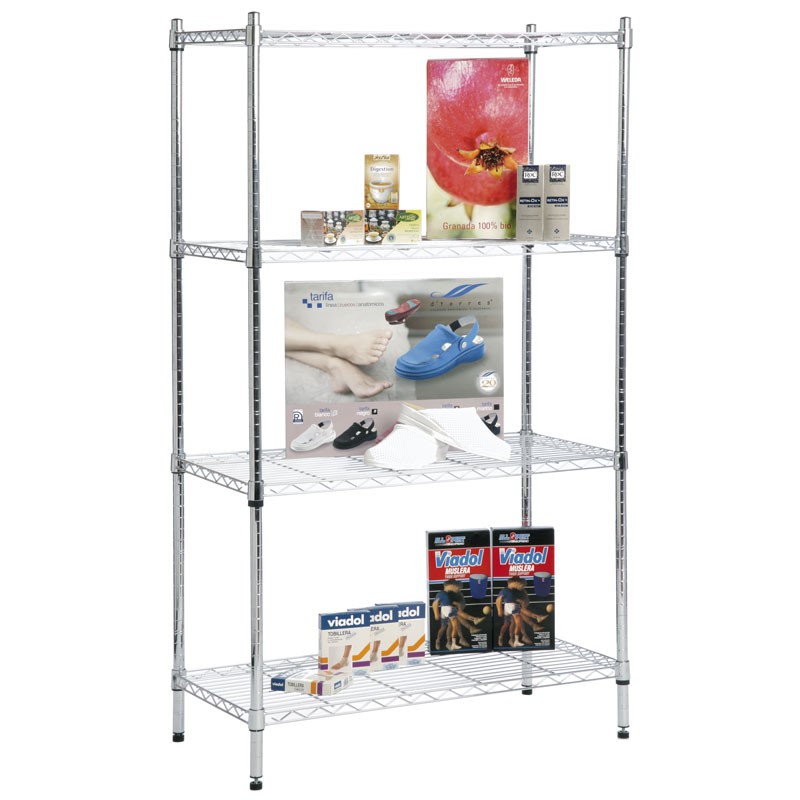 Estantería cromada de 1600mm x 350mm x 900mm, ideal para organizar el almacenaje en diferentes ambientes: comercios, tiendas, hogar y despachos. Su diseño se ajusta perfectamente a estilos clásicos y modernos. No necesita tornillos para su montaje, además se pueden añadir niveles y personalizar.