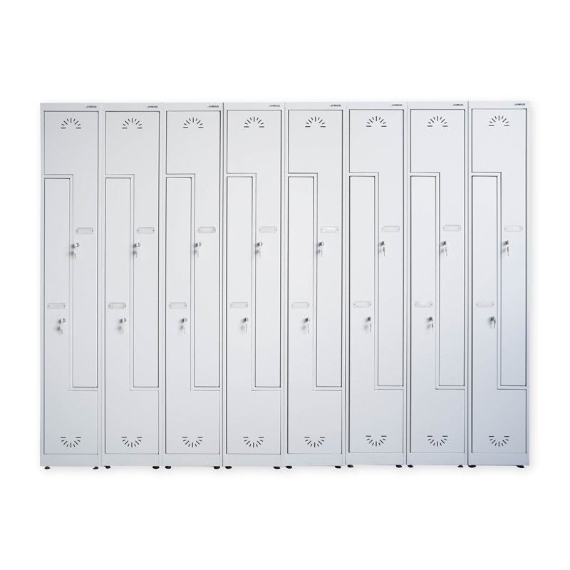 Cada columna se divide en dos compartimentos entrelazados en forma de “L” invertida. Esto permite que cada usuario tenga una sección vertical estrecha para colgar prendas largas (Como abrigos) y una sección más ancha para objetos personales o calzado.